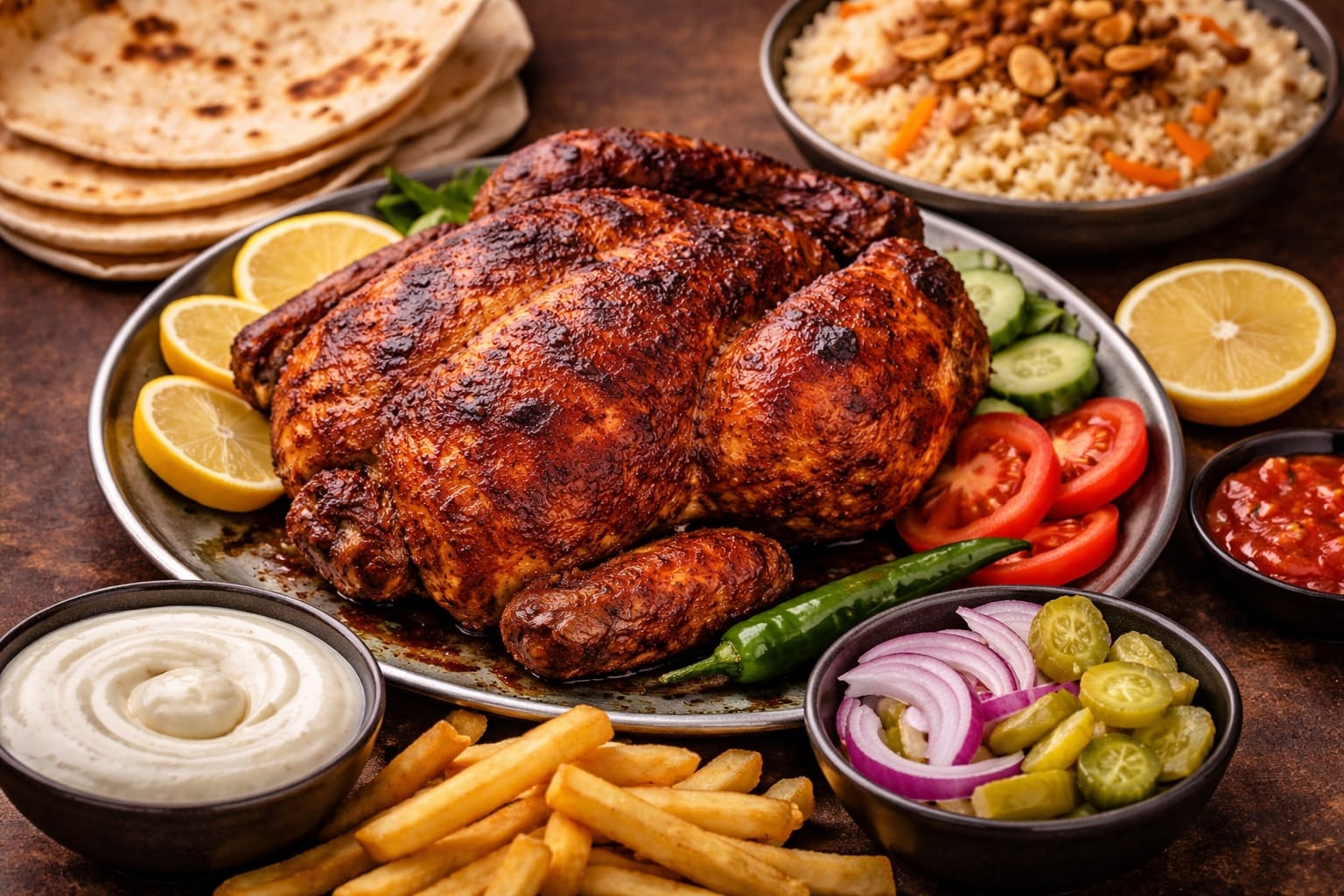 Let the chicken rest for 10 minutes before cutting. Serve hot with garlic sauce, kuboos, fries, or Arabic rice.
