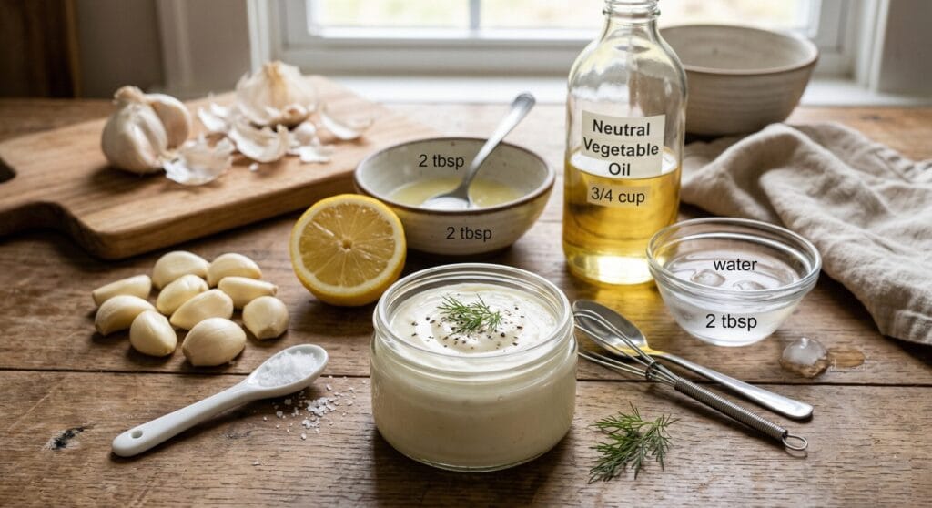 Blend the garlic and salt until very smooth. Add the lemon juice and blend again. With the blender running, pour in the oil very slowly in a thin stream until the sauce becomes thick and creamy. Add a little ice water if needed to loosen it slightly and help it turn fluffy.